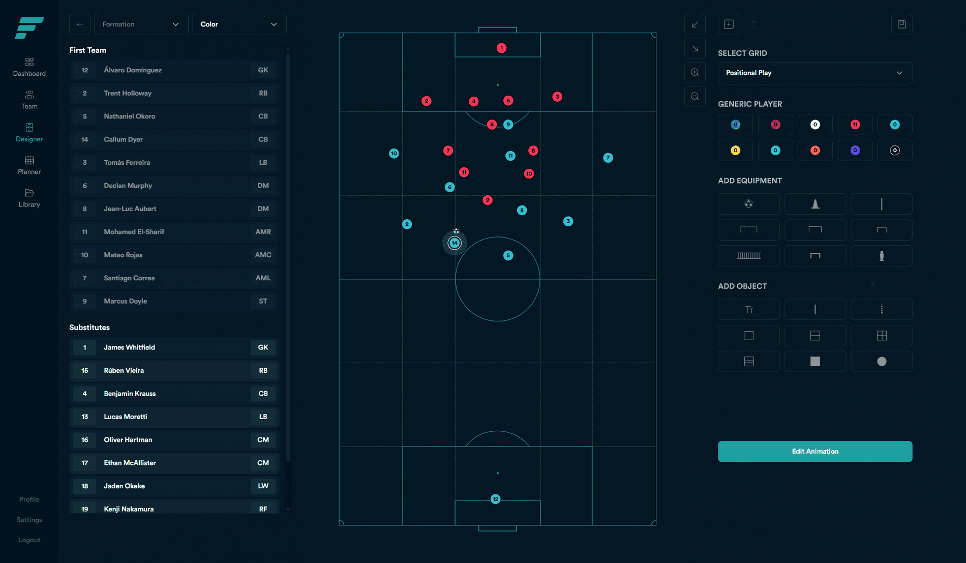Design clear tactical diagrams and fluid animations with ease. Choose your pitch size, add grids, and use a wide array of training equipment to bring your ideas to life.